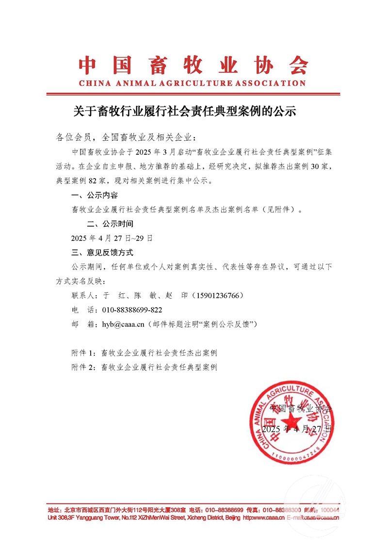 关于畜牧行业履行社会责任典型案例的公示