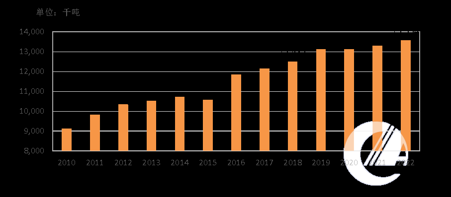 全球鸡肉出口量呈现增长态势,由2010年的890万吨增长至2022年的1,355万吨,平均复合增速为3.35%。2022年鸡肉出口量创历史最高记录,比2020年增长2.00%,增速明显放缓。