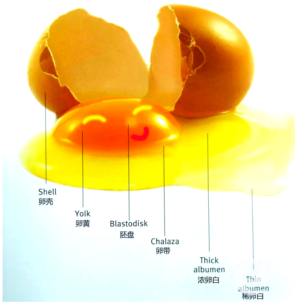 卵白,主要由水和10%的蛋白质精妙构成。其浓稠部分,即浓卵白层,富含粘性凝胶,而外部和内部的稀卵白则凝胶含量较少。随着鸡蛋储存时间的延长,蛋白的PH值逐渐上升,这会导致原本粘性强的浓卵白逐渐稀化。一旦卵白变稀,它便无法再稳固蛋黄的位置,同时,水分也会从蛋白中渗透进入蛋黄。